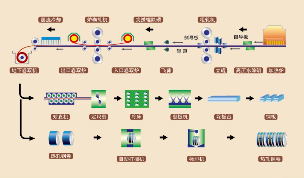 ![]() | 軋鋼分廠主要有步進式加熱爐,立輥軋機和四輥可逆式軋機等設備,可實現(xiàn)厚度3-16mm,寬度800-1600的卷軋制,最厚100mm,寬度1600mm中厚板的軋制。 |