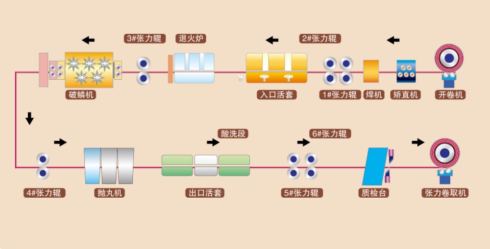 ![]() | 退洗分廠主要有臥式連續(xù)退火爐,破磷機,拋丸機,化學酸洗等設備,可實現(xiàn)奧氏體不銹鋼,鐵素體不銹鋼,雙相不銹鋼等多種類不銹鋼卷的連續(xù)退火酸洗。 |