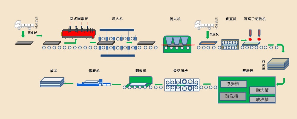 ![]() | 退火酸洗中板線主要有室式固熔爐,全自動中板淬火機組,拋丸機,矯直機,酸洗池等設備,可實現(xiàn)最寬3200mm,最厚90mm中板的退火酸洗。 |